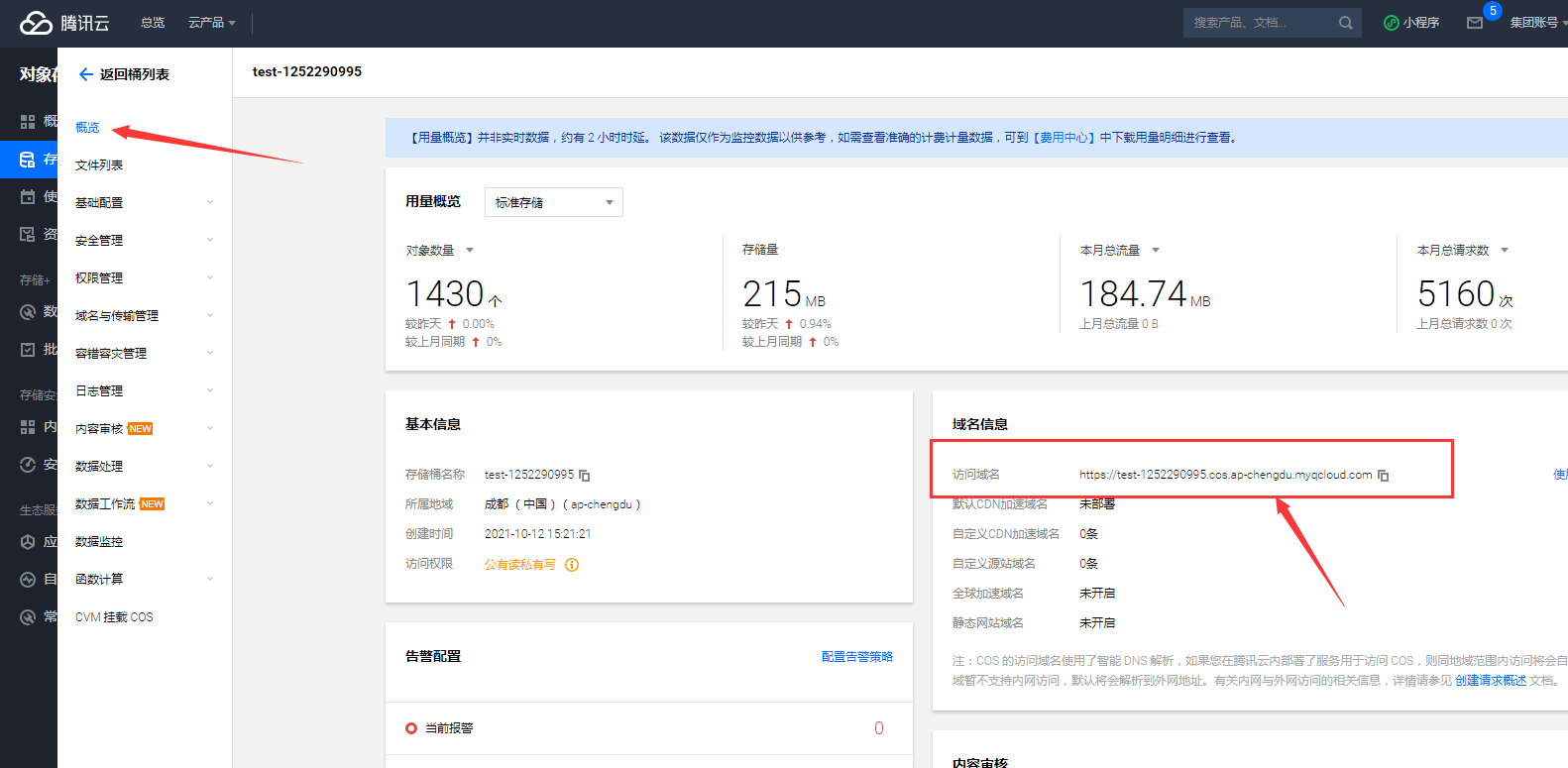四、源站域名填寫(xiě),在所選擇的存儲桶管理頁(yè)面左側欄,選擇“概覽”,然后在右側域名信息框找到“訪(fǎng)問(wèn)域名”,填到優(yōu)采云設置中,注意只填域名,不需要加"http://"或者"https://"。
