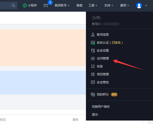 一、SecretId和SecretKey的填寫(xiě),先在騰訊云控制臺,鼠標指向右上角頭像,在彈出的菜單中點(diǎn)擊“訪(fǎng)問(wèn)管理”菜單。