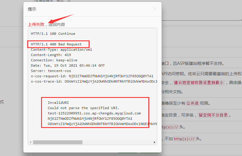 如果上傳失敗,將顯示騰訊云COS返回的錯誤信息: