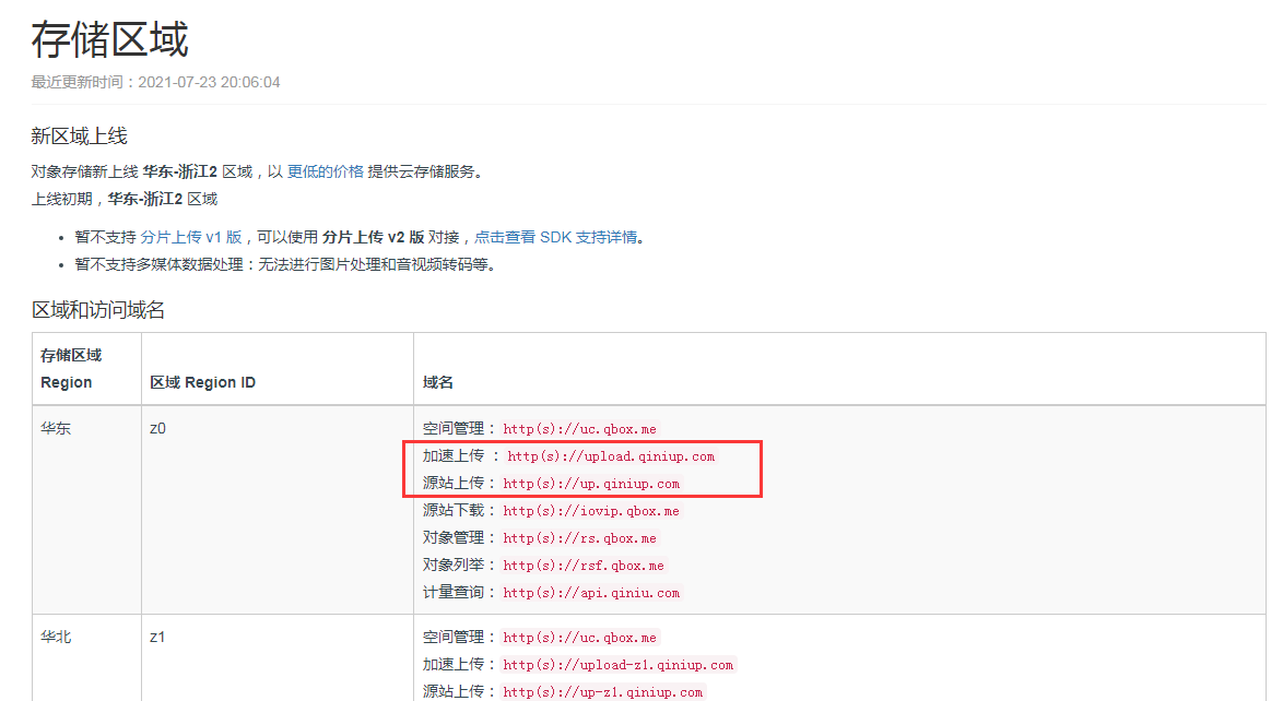 四、上傳域名填寫(xiě),根據空間所在區域,在七牛云存儲區域列表查詢(xún)對應的源站上傳域名或加速上傳域名,填到優(yōu)采云設置中,注意只填域名,不需要加"http://"或者"https://"。