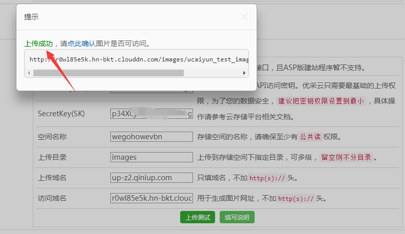 六、以上信息填寫(xiě)完后,請點(diǎn)擊下方“上傳測試”按鈕,優(yōu)采云系統將嘗試上傳一個(gè)圖片到您的存儲空間中,如果上傳成功,將顯示生成的圖片網(wǎng)址: