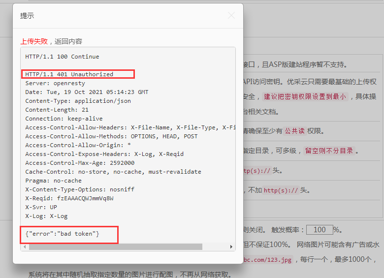 如果上傳失敗,將顯示七牛云返回的錯誤信息: