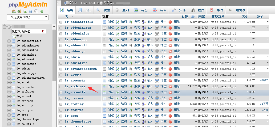 1. 登錄phpmyadmin進(jìn)入數據庫,找到archives這個(gè)表。(這里用來(lái)舉例的數據庫前綴是‘lw’,數據表名即為lw_archives)