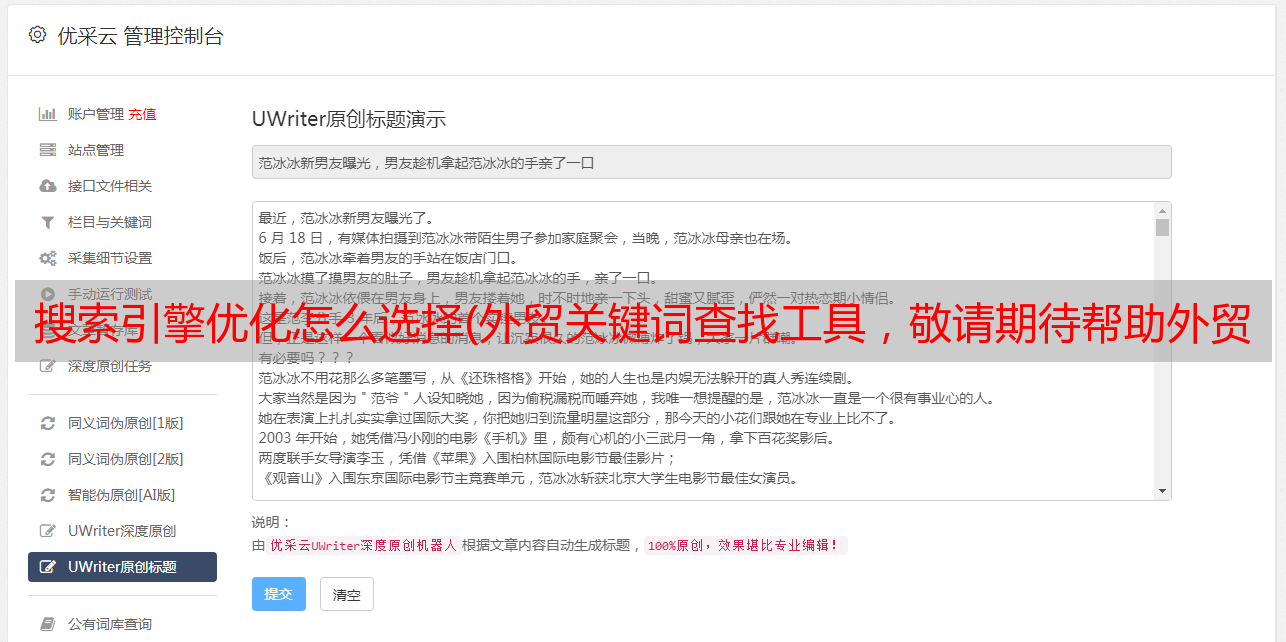 優(yōu)采云 發(fā)布時(shí)間: 2021-11-01 09:07搜索引擎優(yōu)化怎么選擇(外貿關(guān)鍵詞查找工具,敬請期待幫助外貿客戶(hù)解決難題,最好的方法)