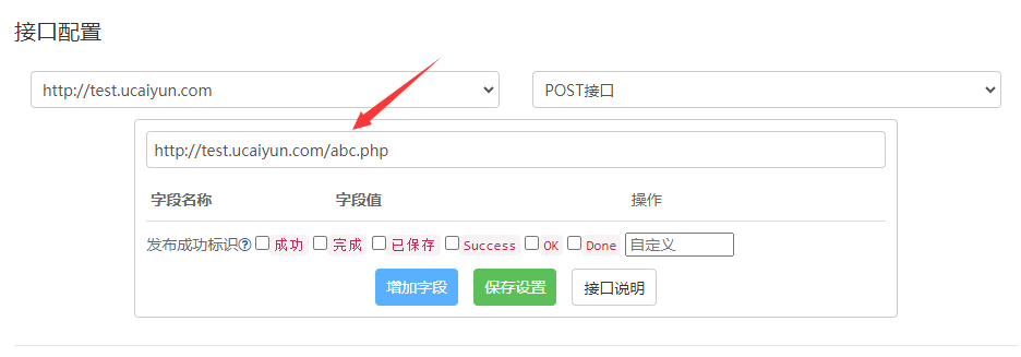 2. 系統會(huì )顯示POST接口配置界面,您需要把上面創(chuàng )建的接口地址填寫(xiě)到接口地址欄,注意此處是完整網(wǎng)址: