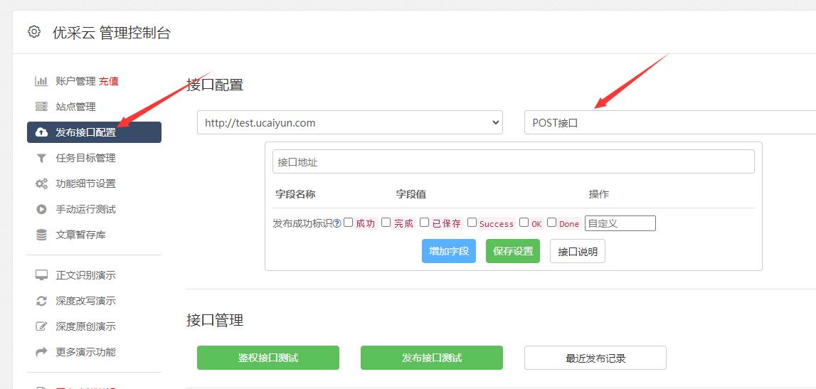 1. 在優(yōu)采云左側欄點(diǎn)擊“發(fā)布接口配置”,在發(fā)布接口配置頁(yè)面,選擇POST接口: