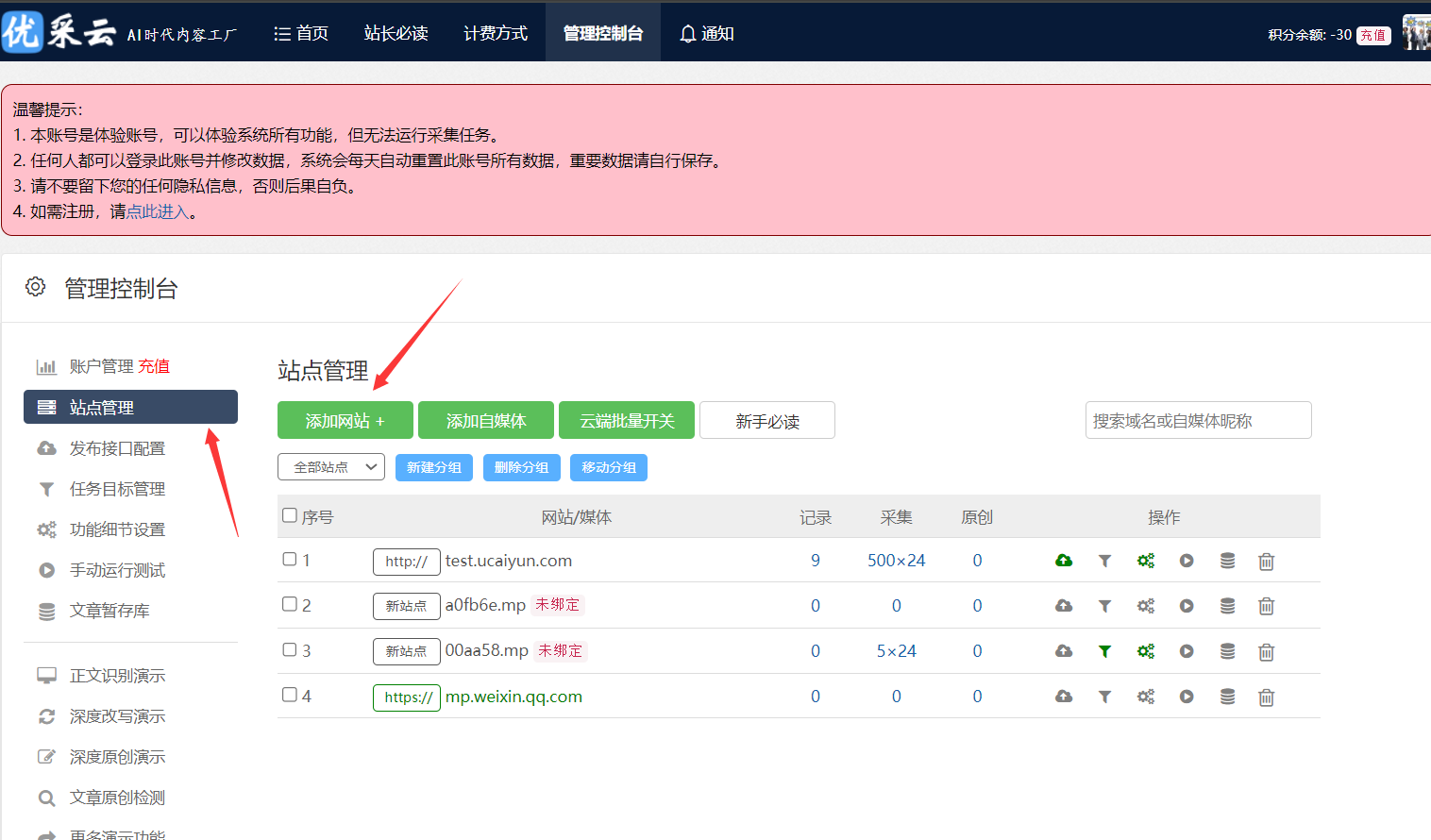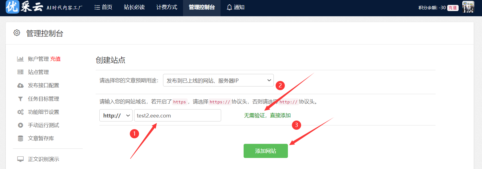 1. 進(jìn)入管理控制臺,點(diǎn)擊左側邊欄“站點(diǎn)管理”,再點(diǎn)擊“添加網(wǎng)站”。