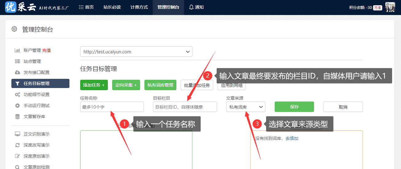 3. 在添加任務(wù)界面,輸入任務(wù)名稱(chēng)、目標欄目ID,選擇文章來(lái)源類(lèi)型: