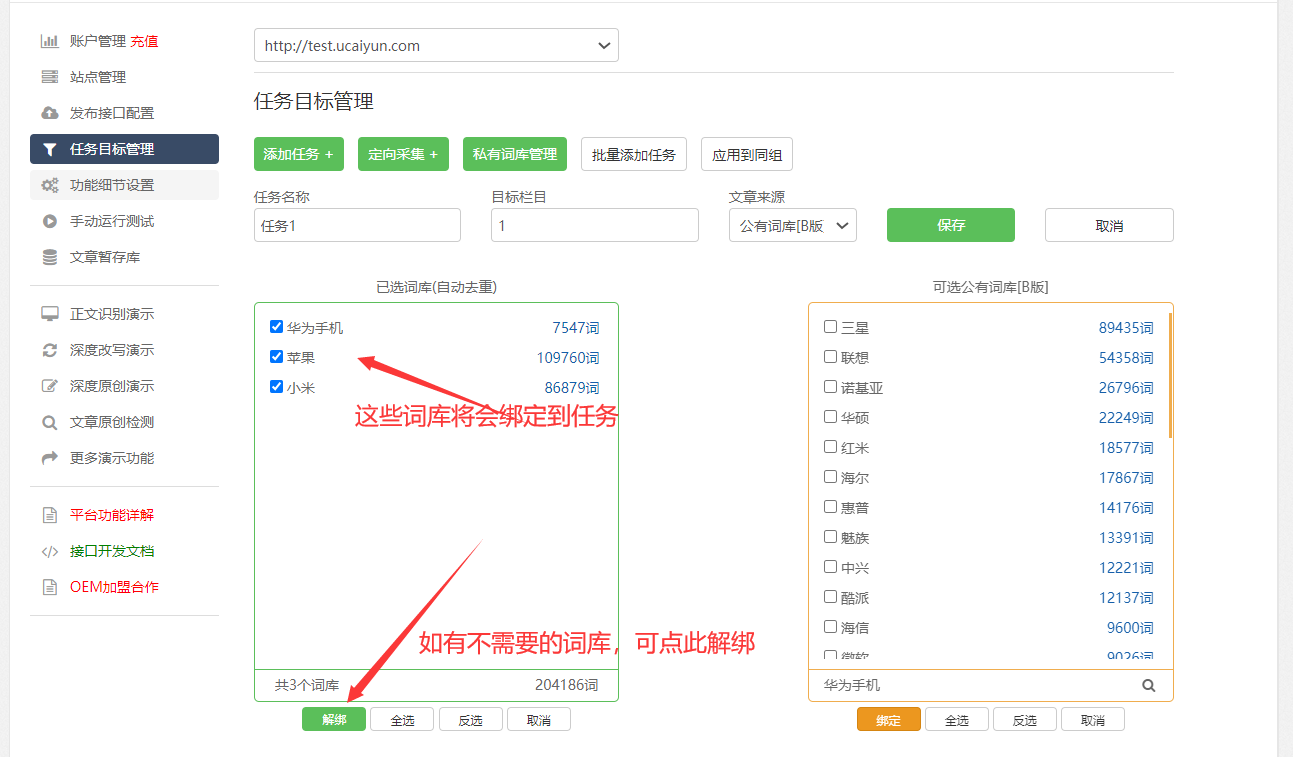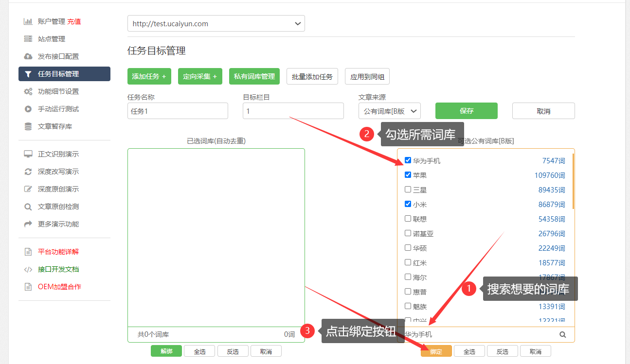 如果選擇公有詞庫A/B/C版,可以直接用關(guān)鍵詞搜索您想要的關(guān)鍵詞庫,綁定到任務(wù)上,詳細操作如下: