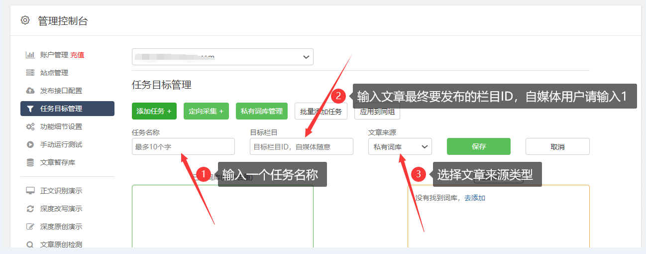 3. 在添加任務(wù)界面,輸入任務(wù)名稱(chēng)、目標欄目ID,選擇文章來(lái)源類(lèi)型: