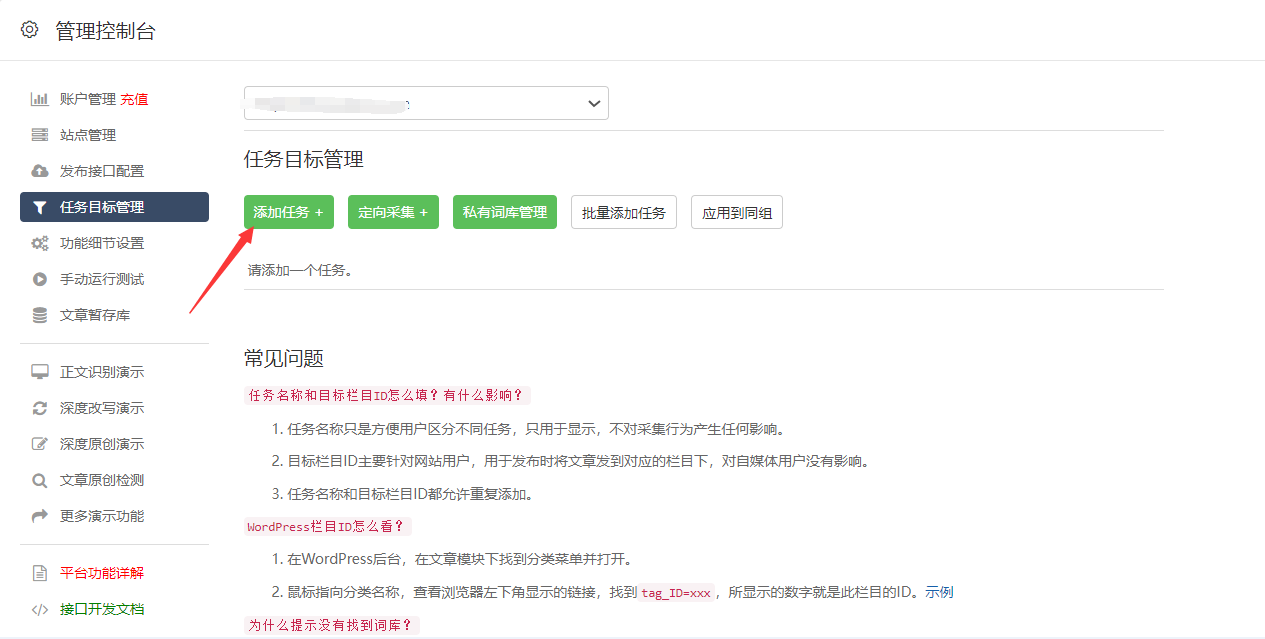 1. 在站點(diǎn)管理頁(yè)面,點(diǎn)擊箭頭所指的圖標進(jìn)入“任務(wù)目標管理”頁(yè)面。