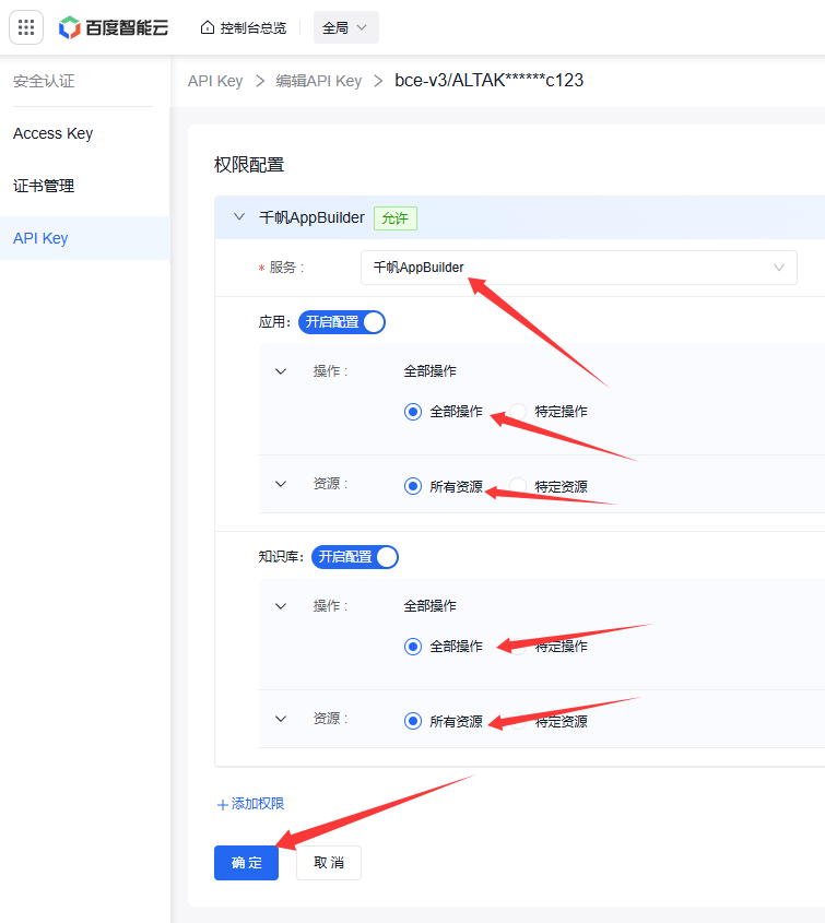 注意API Key需要具有讀取該知識庫的權限,建議直接授予全部權限: