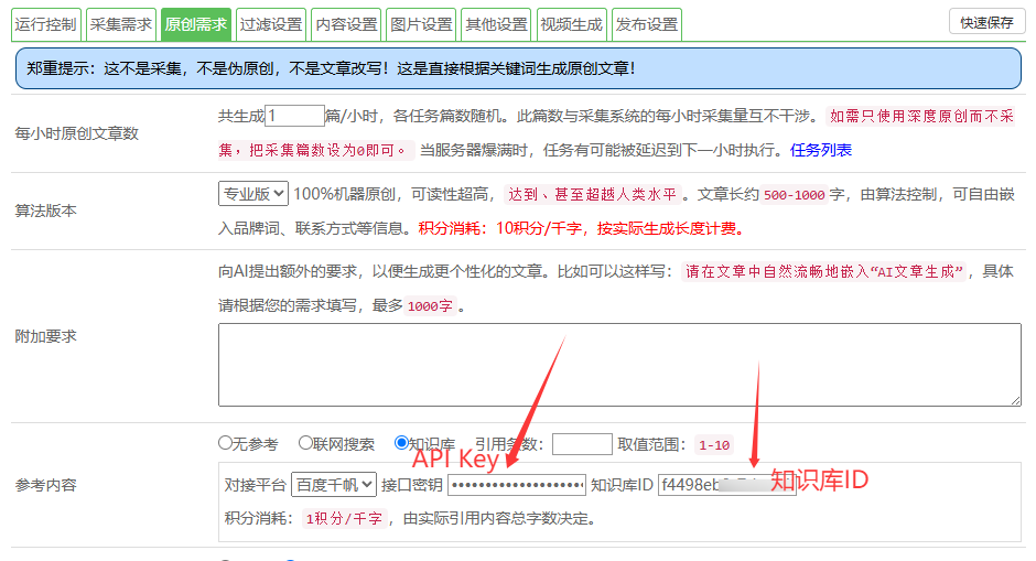 知識庫:當前只支持百度千帆平臺知識庫。需要用戶(hù)先在百度千帆官網(wǎng)創(chuàng )建知識庫,然后把知識庫ID和API Key填寫(xiě)到優(yōu)采云。