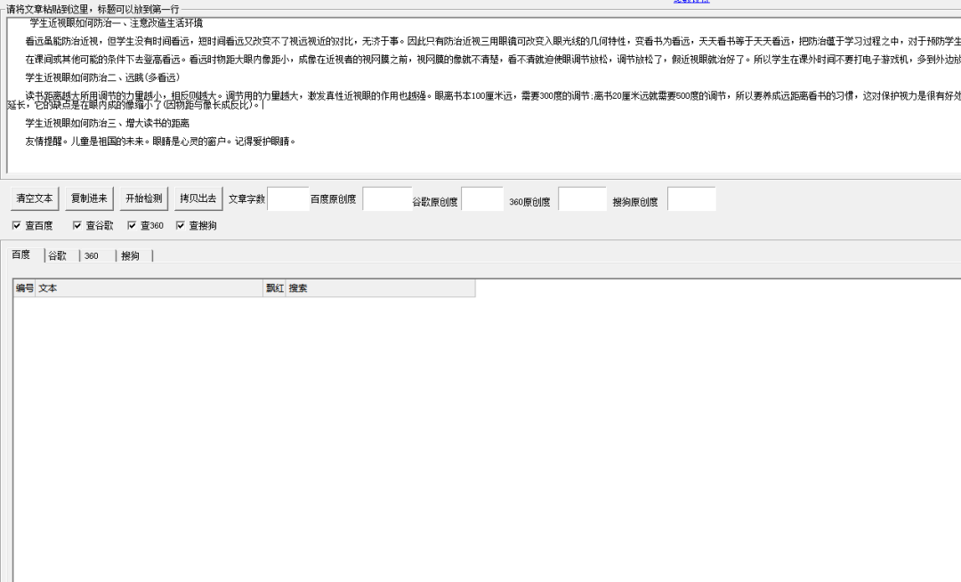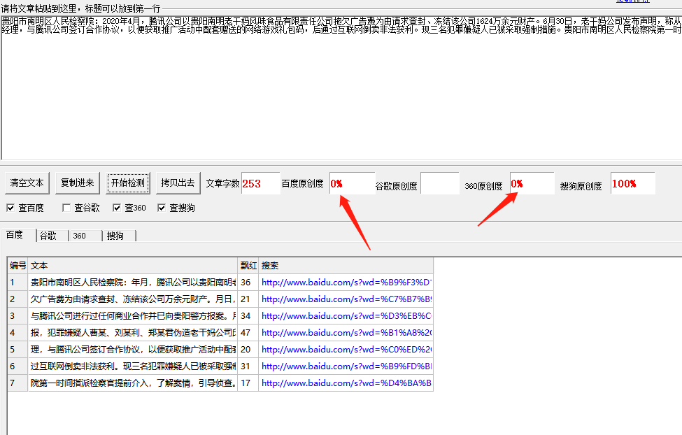 1.在日常編輯管理工作中,本工具可檢測一篇文章中,每個(gè)段落在網(wǎng)絡(luò )上出現的次數(即飄紅次數),進(jìn)而得出文章原創(chuàng )部分百分比。