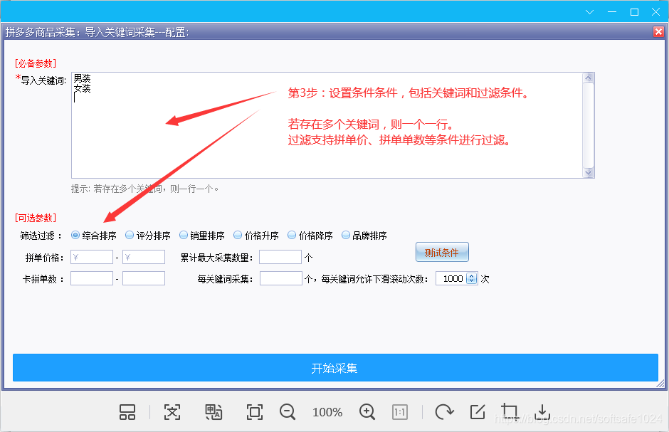 該軟件可以根據關(guān)鍵詞、價(jià)格、銷(xiāo)量等過(guò)濾條件提取拼多多店鋪的商品數據,具體操作如下: