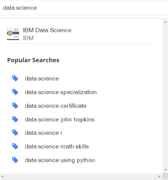 基于已經(jīng)輸入的詞語(yǔ)或者高頻搜索詞, 聯(lián)想詞是對消費者意愿的一種預測。設置聯(lián)想詞不僅可以節省消費者打字的時(shí)間, 也有機會(huì )創(chuàng )造新的銷(xiāo)售線(xiàn)索。最好的情況是除了單純的聯(lián)想詞之外,還能提供一些諸如縮略圖,簡(jiǎn)介,評分等的原數據。如 Cousera 針對搜索詞返回了相應課程的信息
