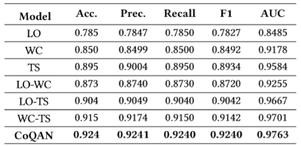 對比實(shí)驗結果顯示,所提方法 CoQAN 在各項指標上均顯著(zhù)達到最佳。實(shí)驗中,基線(xiàn)模型與本文所提模型使用相同的特征,因此模型的優(yōu)越性能受益于作者提出的聯(lián)合網(wǎng)絡(luò )表示學(xué)習架構,可以完備性地學(xué)習到更多有價(jià)值的信息。