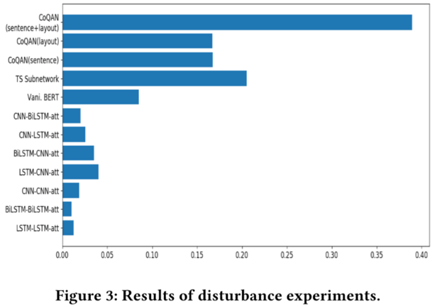 從結果來(lái)看,本文提出的模型顯然比所有對比模型對句子打亂的干擾更為敏感,這表明 CoQAN 可以更輕松地捕獲句子之間的內聚關(guān)系,并學(xué)習內容和寫(xiě)作邏輯的一致性。單文本語(yǔ)義子網(wǎng)絡(luò )(TS)的成功干擾率要高于整體聯(lián)合網(wǎng)絡(luò ) CoQAN ,這是因為擾動(dòng)實(shí)驗是對正樣本進(jìn)行的,而正樣本具有良好的文本質(zhì)量和排版質(zhì)量。因此,當僅打亂句子時(shí),良好的布局會(huì )在一定程度上阻止 CoQAN 將其判斷為負樣本。同時(shí)打亂布局順序和句子順序時(shí),成功干擾的比例遠高于單一維度下的干擾。這些結果證明了本文提出的 CoQAN 成功地學(xué)習到了文本寫(xiě)作和頁(yè)面布局的知識。