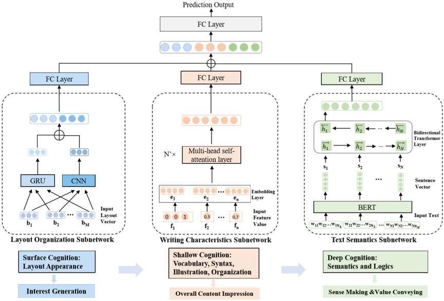 圖 2 展示了本文提出的自媒體在線(xiàn)文章質(zhì)量評估的 CoQAN 網(wǎng)絡(luò )架構,其中設計了三個(gè)子網(wǎng)絡(luò )來(lái)解耦布局組織、寫(xiě)作特征和文本語(yǔ)義的建模。
