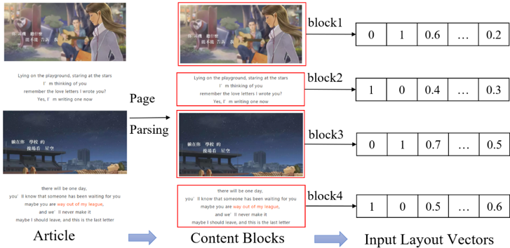 對于布局建模,研究者考慮了人們在終端上閱讀自媒體文章時(shí)從上到下滑動(dòng)瀏覽的順序閱讀習慣,將文章劃分為內容塊序列,顯式地學(xué)習文章圖文標題等要素的排版布局,并同時(shí)捕捉整體的頁(yè)面布局和局部的排版模式。